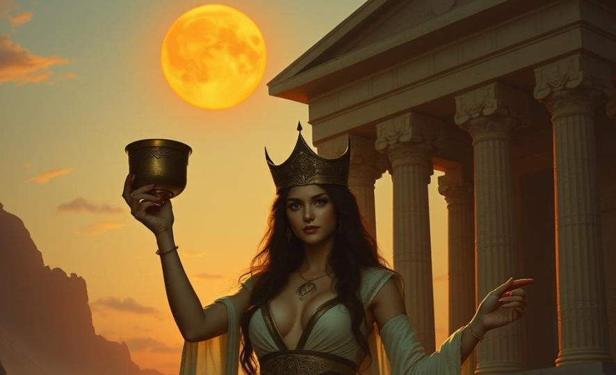 - Het eerste hologram, dat van de Koning met de Kist, heeft connotaties met koningschap (hermelijnbont) maar ook met het christendom (doornenkroon) en de strijd tegen het kwaad (drakenkop). In de dialoog wordt hij met heerschappij verbonden, en met de aversie van heersers tegen kritische gedachten van onderdanen. Het tweede hologram, dat van de Priesteres met de Schaal, lijkt dualer neergezet te zijn, gezien haar gezicht (half zwart, half rood) en haar attributen (dolk en kelk). De roze bloem in haar schaal lijkt mij de lotus, symbool van zuiverheid, verlichting en bovendien van zowel potentie als schepping.